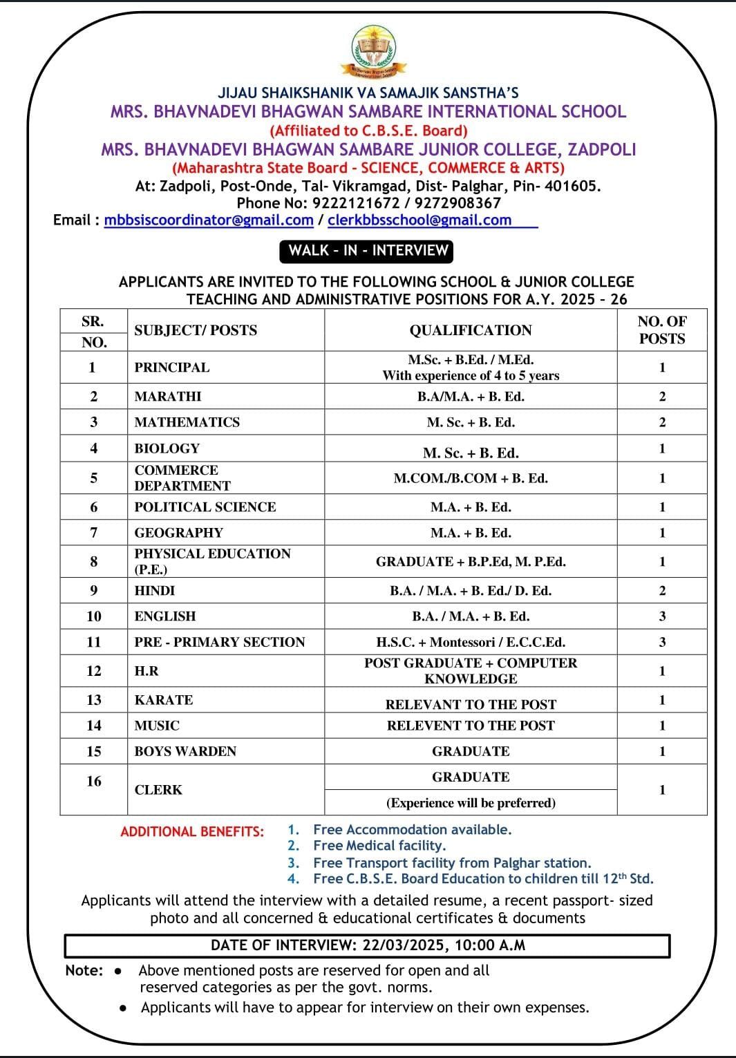 Zadpoli, Palghar – Jijau Shaikshanik Va Samajik Sanstha’s Mrs. Bhavnadevi Bhagwan Sambare International School (affiliated with CBSE) and Mrs. Bhavnadevi Bhagwan Sambare Junior College (Maharashtra State Board – Science, Commerce & Arts) invite applications for various teaching and administrative positions for the academic year 2025-26.